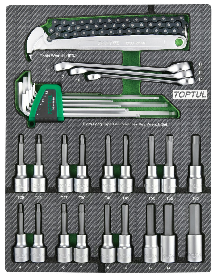 Набор торцевых насадок, шестигранники Г-образные и разрезные ключи, 31 пр. в мягком ложементе TOPTUL GEB3109 купить в Владивостоке и других городах России